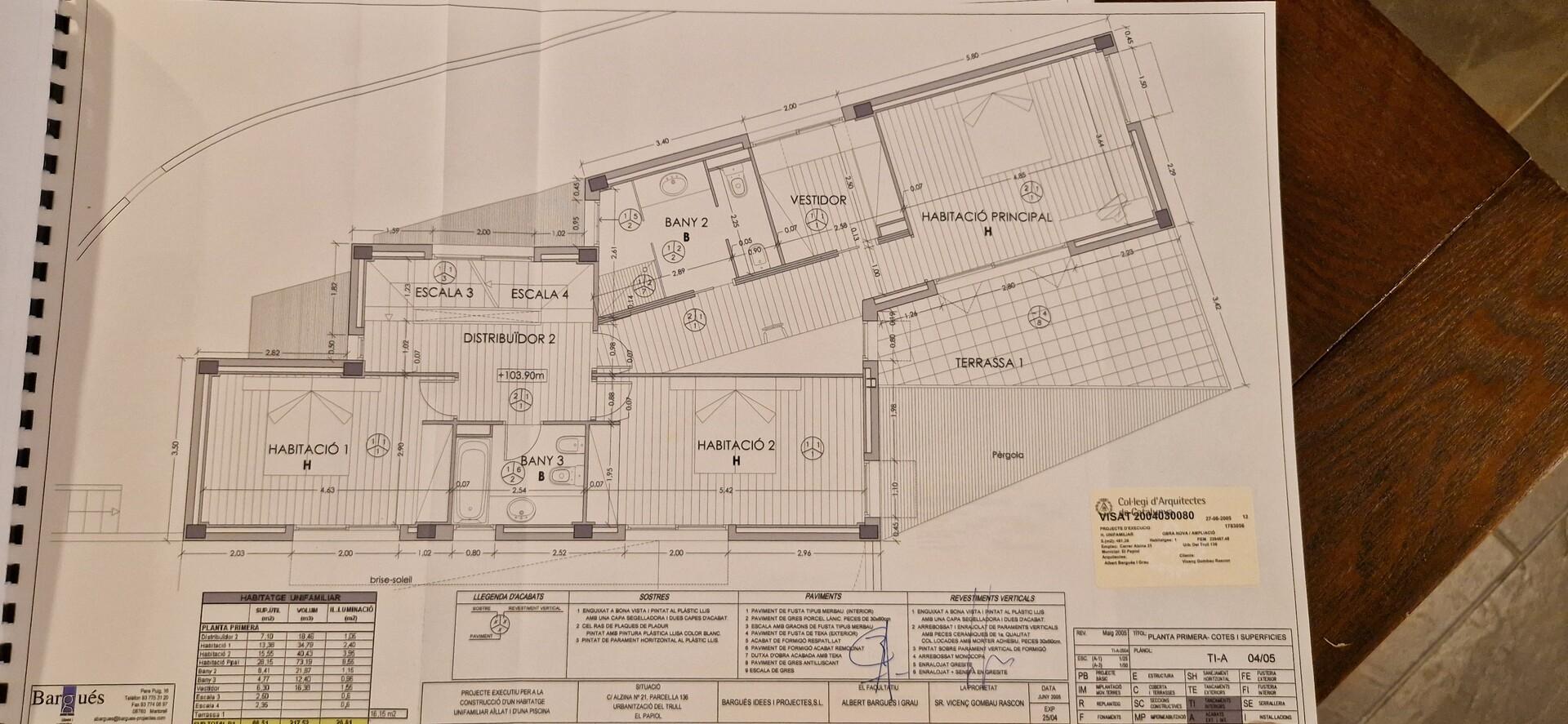 Planta primera 108 m² + terrassa de 19 m²: Planta d´habitacions, hi ha 2 habitacions dobles que comparteixen 1 bany i una gran suite amb vestidor, bany complet, dormitori i sortida a una terrassa amb vistes clares.