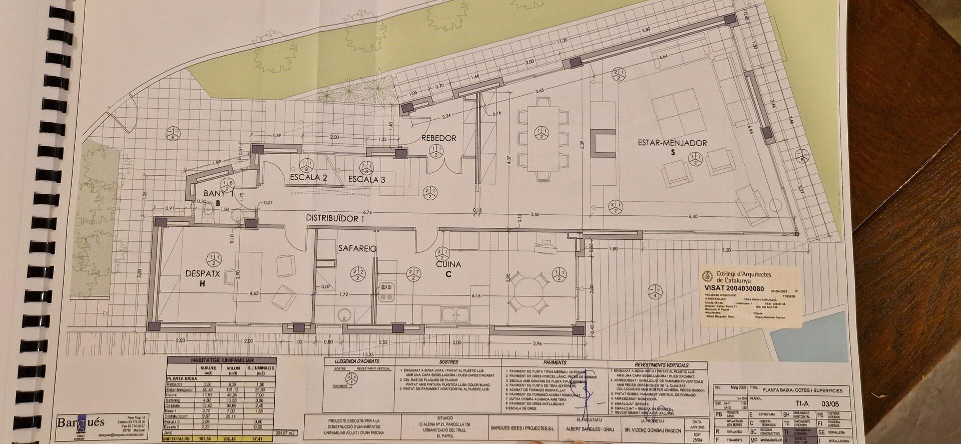 Planta baixa 127 m²: Entrem a la vivenda per un rebedor que dóna accés al saló amb llar de foc i menjador, una estança àmplia amb molta llum i sortida al jardí. La cuina consta de zona de treball i menjador de diari amb sortida al porxo i bugaderia. A la mateixa planta hi ha un despatx/habitació i lavabo de cortesia.